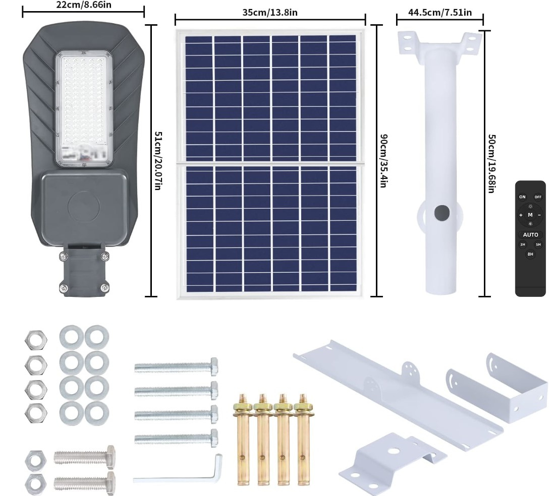 Polikrzemowy panel słoneczny o wymiarach 45 x 35 x 1,7cm absorbuje światło słoneczne w ciągu dnia i przekształca je w prąd, który jest magazynowany w baterii. Wbudowany system AI 6. generacji sprawia, że lampa solarna może być ładowana również w deszczowe, pochmurne dni, a jednocześnie można ją dostosować do rzeczywistej mocy baterii.