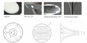 3) Oprawa oświetleniowa ● najczęściej stosowane lampy uliczne LED, parkowe typu kula zasilane bezpiecznym napięciem 12V lub 24V ● dzięki zastosowaniu lamp niskonapięciowych nie są wymagane specjalne certyfikaty bezpieczeństwa ● może być w wersji ze zintegrowanym panelem i baterią lub każdy element osobno ● możliwy rozsył światła drogowy lub dookólny ● wydajnośc - ilość lumenów na wat energii pobieranej przez urządzenie ● wysokość, na której zamontowana jest lampa - zazwyczaj lampę montuje się poniżej panelu, np. wysokość słupa 6m i wysokość montażu lampy 5,6m ● określenie obszaru, który ma zostać oświetlony (np. ulica 2-pasmowa, pas 4m szerokości, słup zlokalizowany 1m od krawędzi ulicy) jest kluczone przy dopasowaniu parametrów lampy |  |