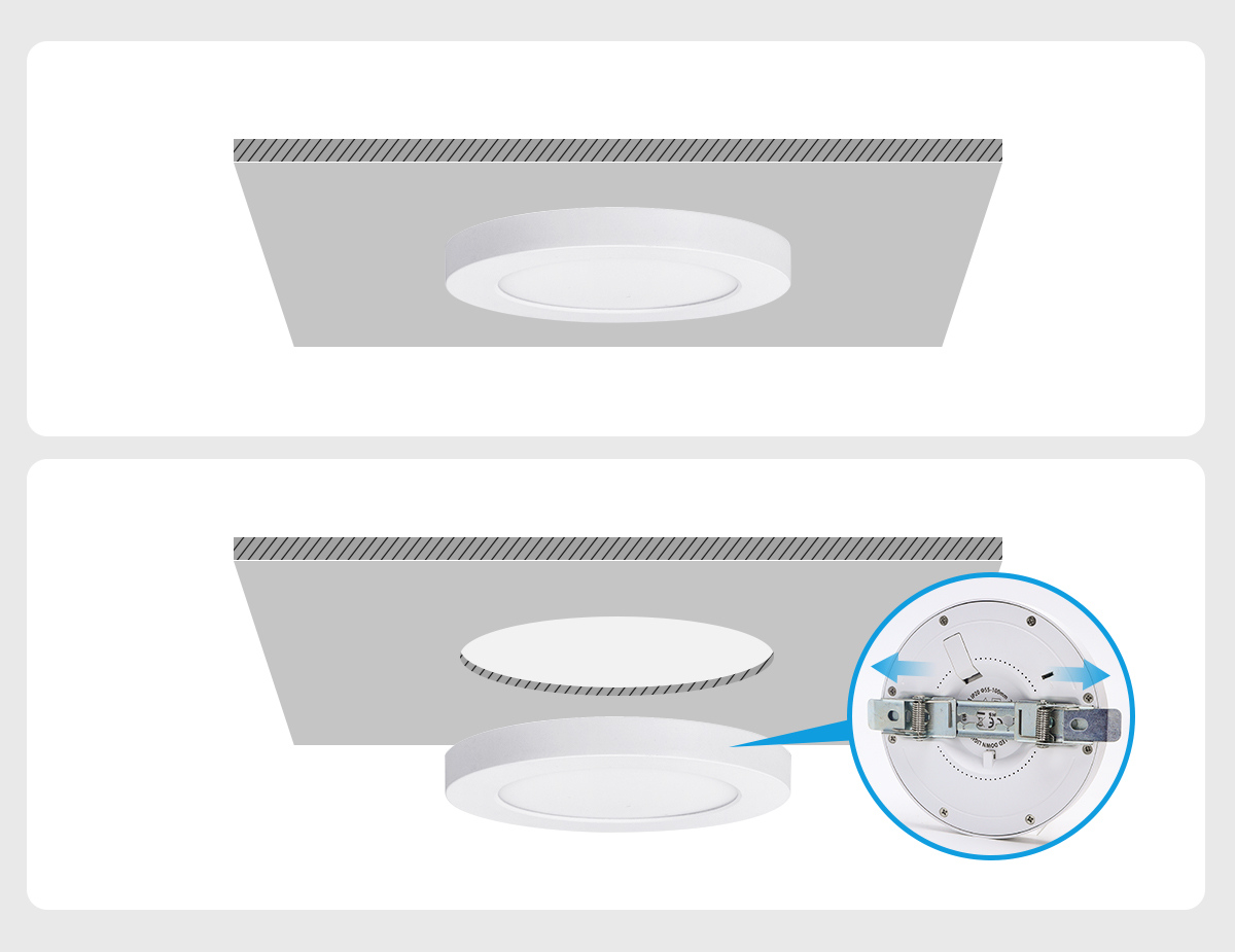 Przy montażu natynkowym na suficie nie musi być robiony otwór, proste i pewne w montażu; w przypadku montażu podtynkowego wystarczy lekko nacisnąć klamrę, aby dostosować rozmiar otworu, łatwe w montażu, elastyczne i wygodne.