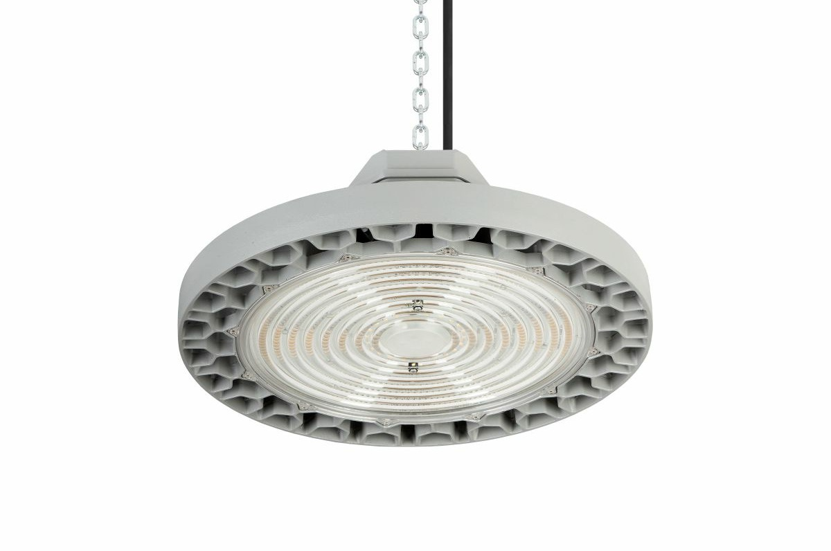 Naświetlacz przemysłowy typu high-bay do montażu zwieszanego. Strumień 23000 lm, moc nominalna 141 W, barwa 4000 K, IP66, IK09, kąt świecenia 105 stopni, temperatura pracy od -25 do +60 C. Korpus aluminiowy, klosz PC.