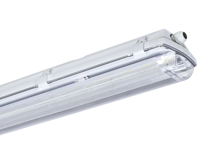 Oprawa przemysłowa do oświetlania wąskich przestrzeni i alejek regałowych, przeznaczona do montażu natynkowego lub zwieszanego.