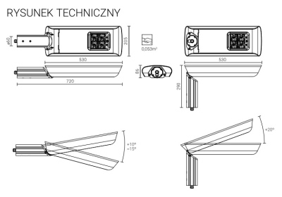 | Montaż | bezpośrednio na słupie z zakończeniem ⌀ 60 x 180 mm lub na wysięgniku z zakończeniem ⌀ 60 x 100 mm |