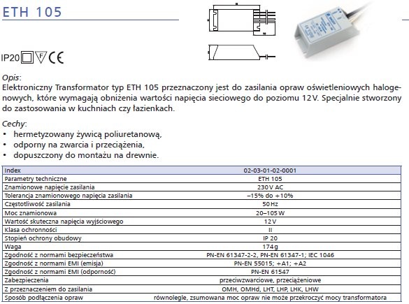 Transformator elektroniczny do opraw halogenowych ETH 105