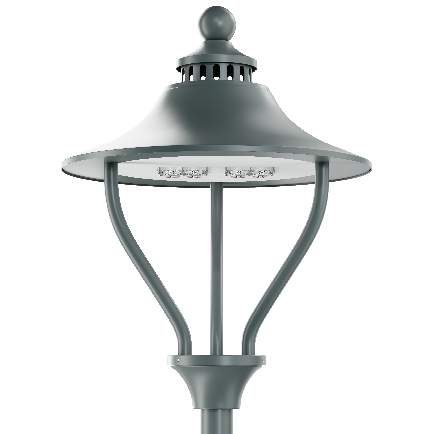Klasyczna oprawa parkowa przystosowana do mocowania bezpośrednio na słupie o średnicy 60 mm lub systemie ramion Aria / Aria Bis. Aluminiowy korpus stanowi szczelną komorę osprzętu, a kopuła osadzona jest na ukształtowanych profilach połączonych z dolną rozetą mocującą.