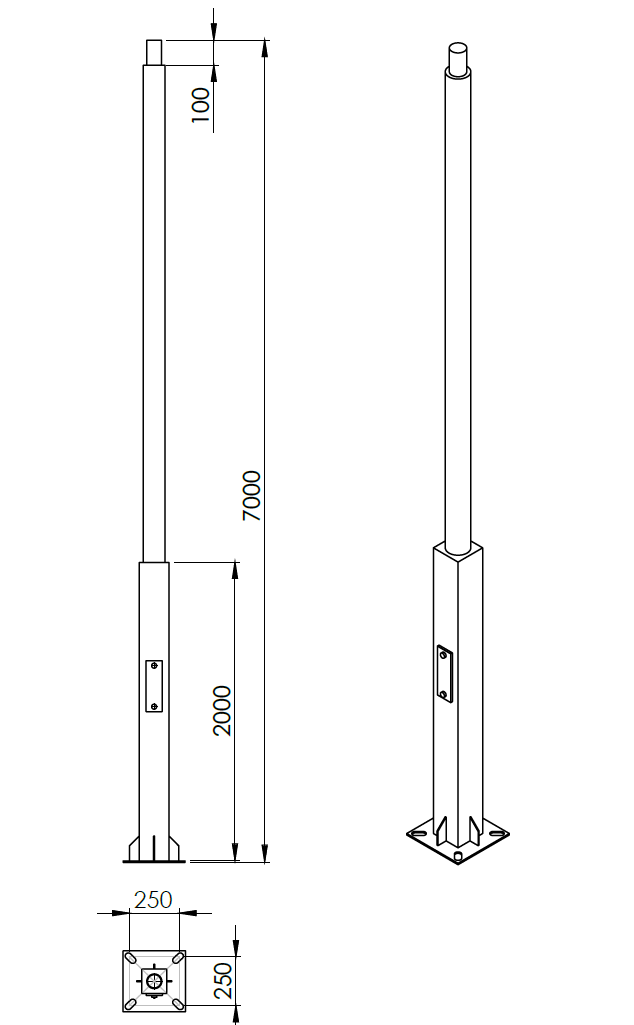4) Słup oświetleniowy + fundament ● najczęściej wykonany ze stali ocynkowanej osadzony na fundamencie ● fundament wchodzi w skład zestawu w przypadku zestawów ze słupem ● słup do lamp solarnych wyposażony jest w spcjalne wsporniki umożliwiające montaż paneli ● słup oświetleniowy musi wytrzymywać całkowitą masę systemu oświetlenia |  |